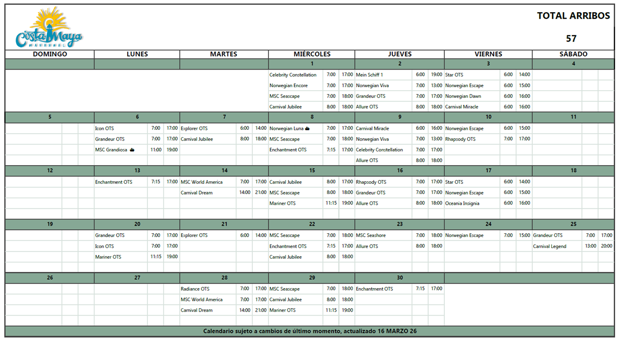 The information presented in this section of the domain www.MAHAnow.com has been granted by the Costa Maya Port of Mahahual, Quintana Roo, Mexico a few days before the start of each month and, due to weather issues, the calendar may be modified.